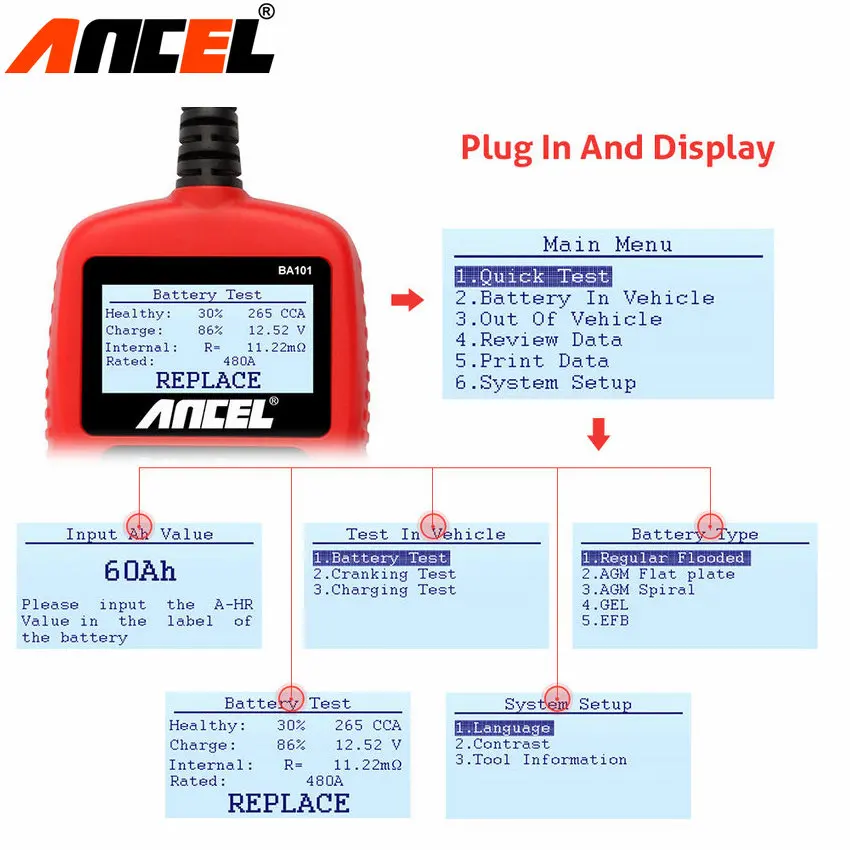 ANCEL BA101 12V LCD Auto Battery Tester Analyzer Tool GEL AGM EFB 100-2000 CCA