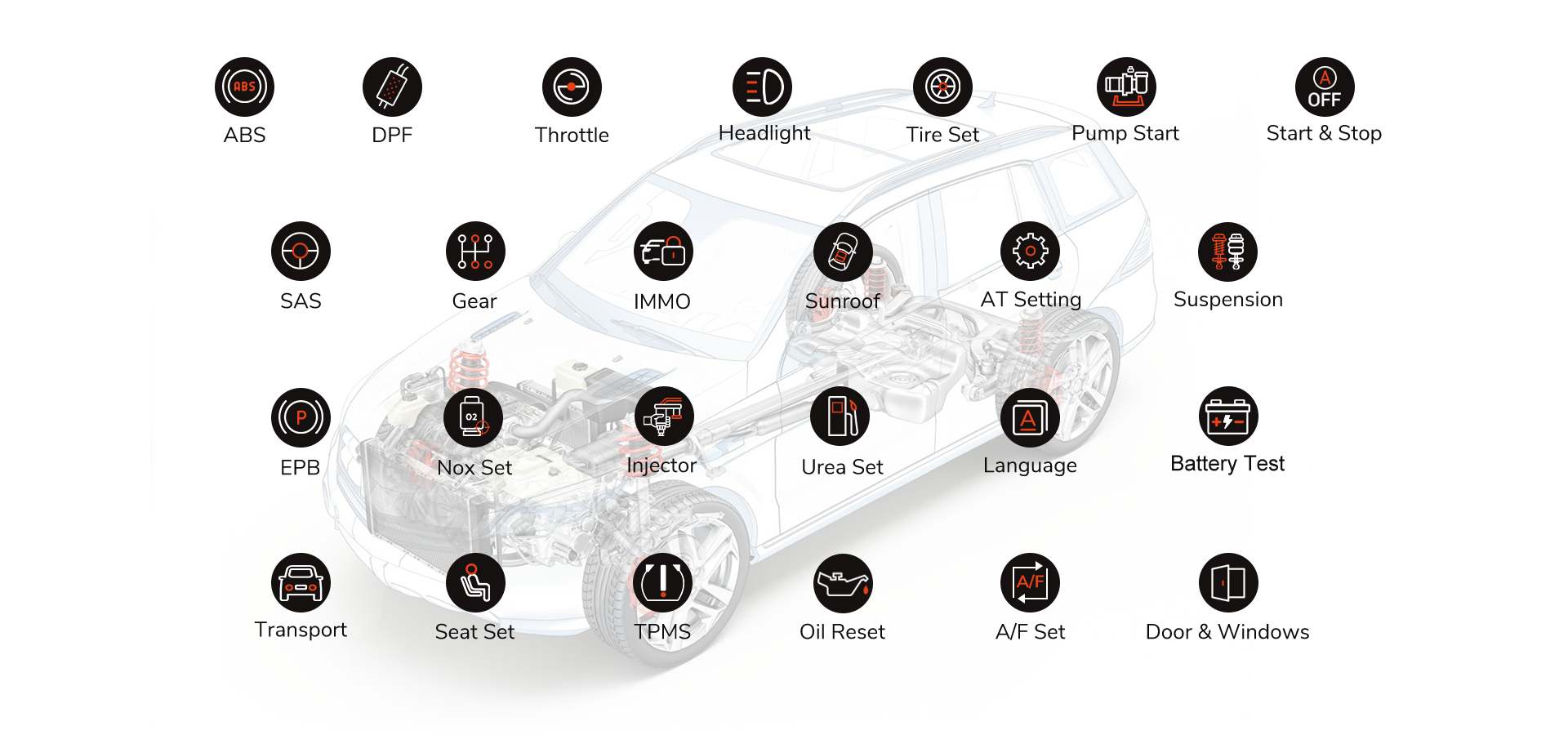 Supporting 25 most commonly used service Reset Functions: ABS Bleeding, AT Set, Battery, DPF, EPB, Gear, Headlight, IMMO Keys, Injector, Oil Reset, A/F Set, Language, NOx Set, Pump, Seat Set, Star&Stop, Tire Set, Transport, Urea Set, Door&Windows, SAS, Sunroof, Suspension, Throttle, TPMS (Due to variations in country of manufacture, model year, and brand, we recommend that you provide detailed information about your vehicle to our customer service for compatibility verification before purchasing.)