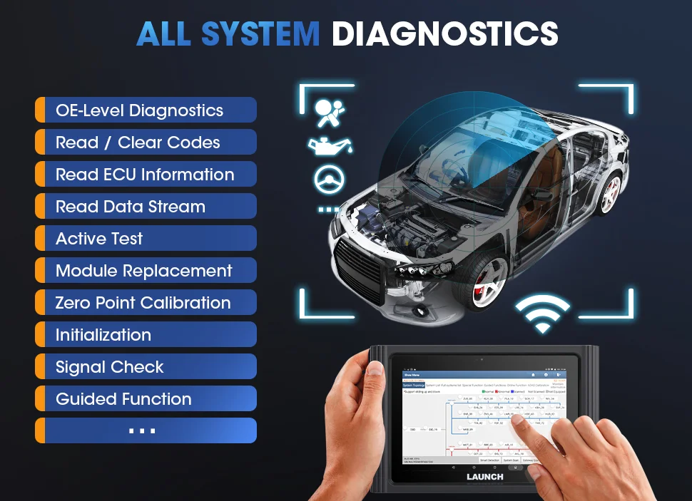 This LAUNCH diagnostic scanner can establish a data link to all systems and subsystems of the vehicle being serviced to: