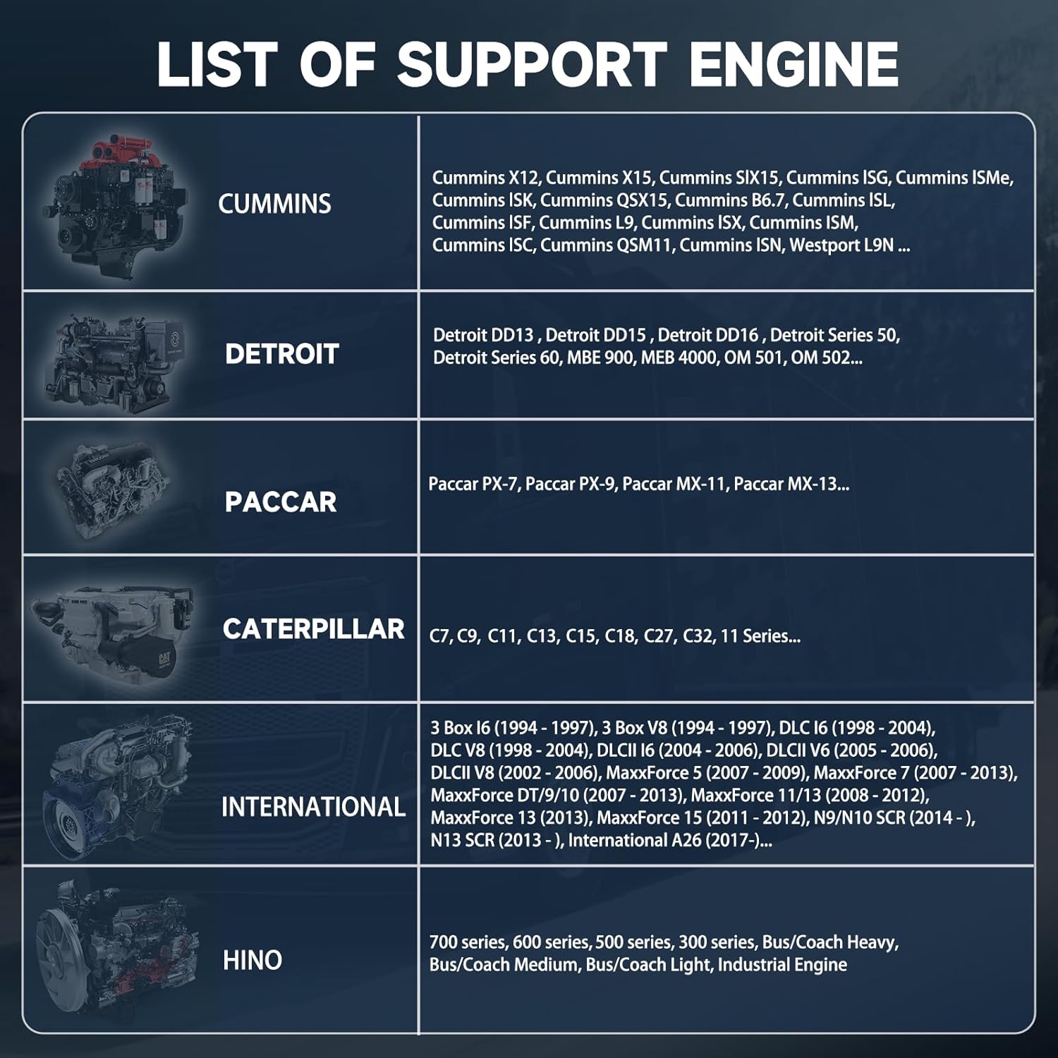 【Diesel Engines】HD500 heavy duty truck scanner is tailored to vehicles equipped with cummins, cat, detroit, paccar, international, hino and more engines. This diesel scan tool come with diverse adapters, including diesel 6 & 9 pin, CAT-9 pin, CAT-14 pin, 16 pin cable. It is engineered to deliver accurate and reliable diagnostics, ensuring compatibility and effective troubleshooting for your trucks.