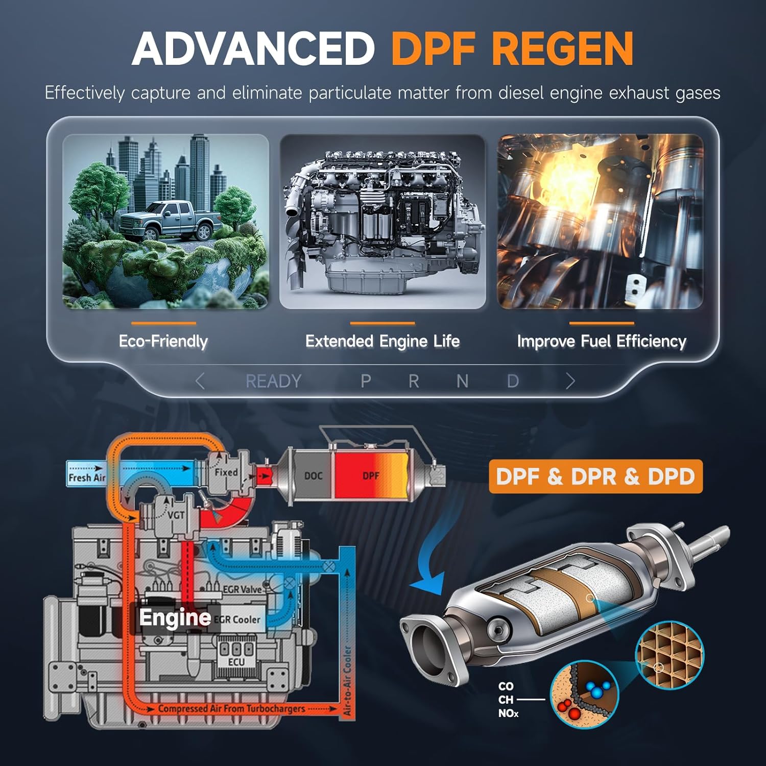 【Advanced DPF Management】The longer a truck is in use, the more particles accumulate in the D.P.F and the more the D.P.F becomes clogged, affecting engine performance and emissions efficiency. This HD500 diesel scanner provides you with DPF regeneration, D.P.F reset, DPD, DPR status control and more functions to achieve efficient cleaning, optimise engine performance and prolong D.P.F life. Save maintenance costs by avoiding D.P.F replacement through regular D.P.F cleaning and D.P.F regeneration. All made easy with the HD500.