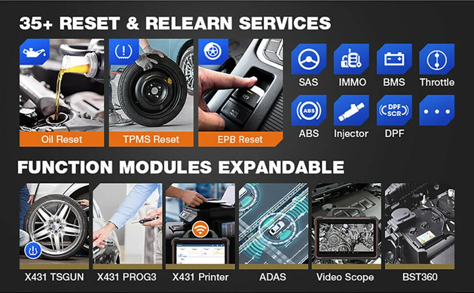 35+ Reset & Relearn Services (Oil Reset, Injector Coding â¦) for necessary repairs and adjustments in workshop; 60+ Advanced Special Functions (PMI, Power Balance, Online Calibration, Online Account Login Service â¦) for complete diagnostics to help grow customer base. Meanwhile, 8 extended modules include Videoscope, Oscilloscope, SensorBox, TPMS Tool, Key Immobilizer and Battery Tester. This pro-level diagnostic scanner has everything to meet your various diagnostic needs and scenarios. **See details on page.