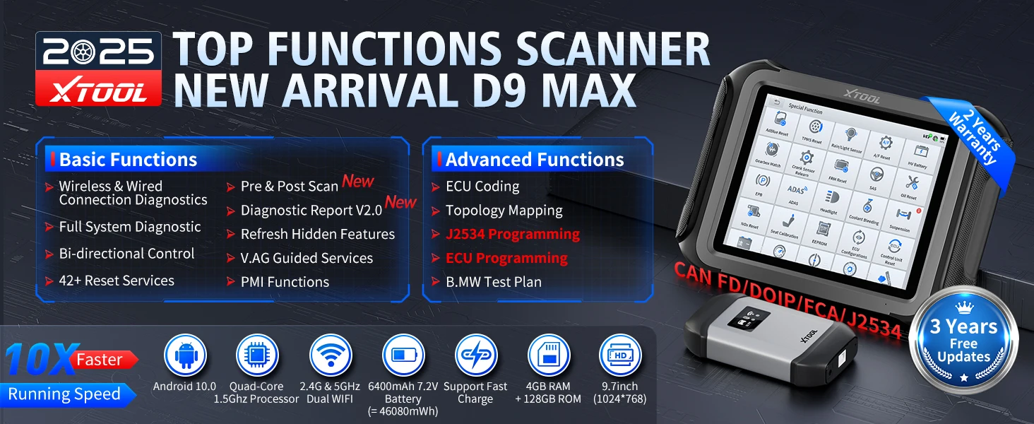 XTOOL D9 MAX Automotive Diagnostic Tool With a large 9.7-inch screen and dual WIFI modules for stable data transfer between the tablet and VCI. Designed for mechanics, electricians and automotive repair stores, it Support ECU Coding and J2534 ECU Programming, Added FCA Autoauth Function, Full-System Automotive Diagnostics, Live Data, Bi-directional Control test, 42+ Common Special Functions, Intelligent Topology Mapping, Refresh Hidden Functions, Immobilizer & Key Programming, 3 Years Software Updates. With 98% vehicle coverage and compatibility with over 100 brands and 10,000 car models, XTOOL D9S Pro Bluetooth Diagnostic Tool is a versatile and reliable tool for any automotive professional.