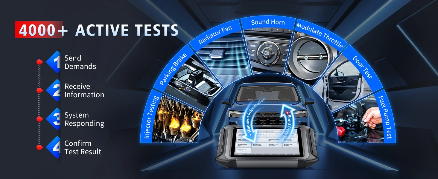 XTOOL D9 MAX OE-Level Full Diagnostic Scanner can scan ECUs in different types of vehicle systems and subsystems such as engine, TCM(Transmission), SRS(Airbag), ABS, TPMS, BCM, BODY, AC and much more, read /clear codes, view the live data from each available system, perform active tests to check the work status of modules, providing you with a Dealership- Level only diagnosis, getting the accurate and in-depth results across all automotive systems. XTOOL D9S Diagnostic XTOOL D9 MAX is a Bi-directional scan tool with ECU codding ,allows you to receive information to and from the vehicle’s onboard computer and can send commands to the vehicle ECU to perform active tests without using the vehicle's controls, like A/C Clutch on/off, Fuel Injectors, (Cycling) ABS Pump Motor, window, door, sunroof, etc. That’s helpful for DIY mechanics, speeding up the troubleshooting process when it’s time to make repairs. Accurately figure out whether a specific system, component, or a subsystem in vehicles goes well and locate the problem by interactively operating and testing the vehicle's related actuators. such as:
