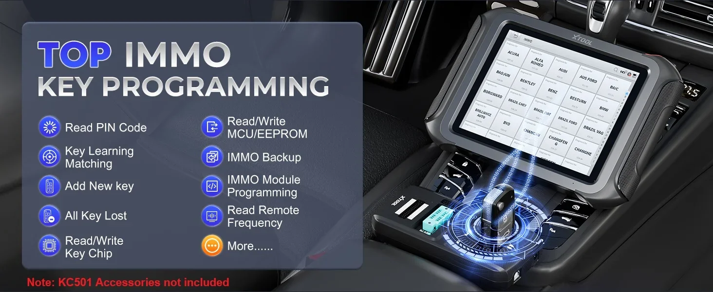 Work with XTOOL KC501 Key Programming Adapter has been extended IMMO functionalities on For BMW CAS4/3/2/1, For Benz FEM/BDC and For VW Group 4th/5th IMMO etc., It designed to work with XTOOL D9S PRO, IP919PRO, D9 MAX Immobilizer Tool to perform various IMMO Key Programmings, Key Chip Programming Functions, MCU Writing and Reading ,etc. Read PIN (All Key Lost), Key Learning, IMMO ECU Reset/Adaption, IMMO ECU Refresh/Coding, Remote Learning...