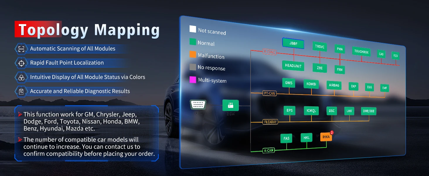 XTOOL D9 MAX smart diagnostic tool features Module Topology to scan all available car modules and show color coded diagnosis status in tree mapping that reveals the underlying communication structures between modules, greatly improved Repair Efficiency for Workshops.