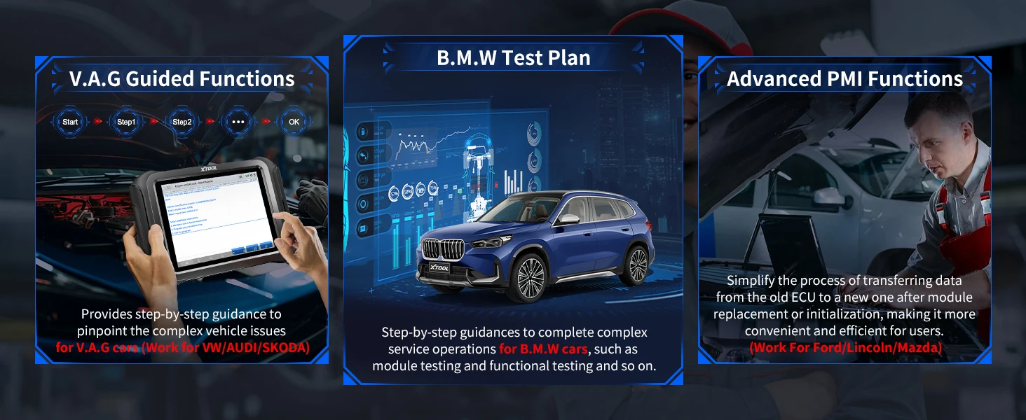 XTOOL D9 MAX Car Diagnostic Tools Performs ECU Coding to flash the Hidden Features. Guide Functions: With Guide Function for VAG/BMW, D9 MAX Can Perform complex functions such as special functions, ECU coding, etc., to help your diagnostic step by step with instructions for VW/for Audi/for Skoda/for BMW, etc.